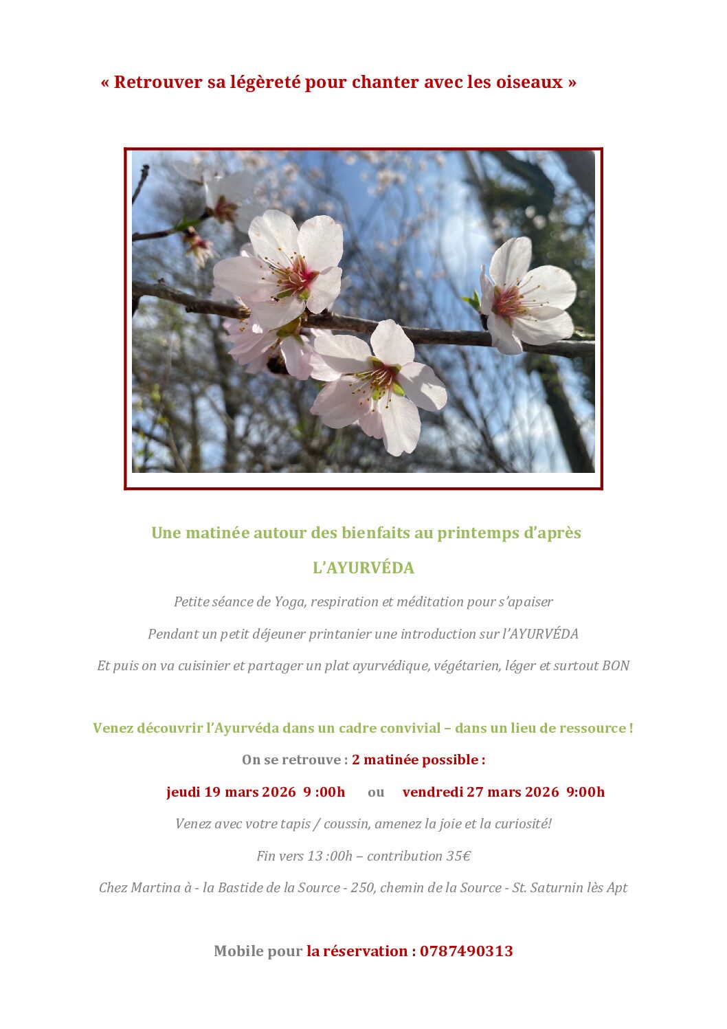 La Bastide de la Source #18: « Retrouver sa légèreté pour chanter avec les oiseaux » 27Mar ayurveda_flyer_editable-1Télécharger Publié le 10/03/2026
