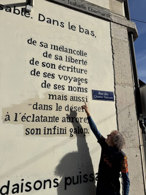A chaque fois que je passe devant cette fresque murale, été comme hiver, j’ai une pensée profonde pour Isabelle Eberhardt et la liberté qu’elle incarne. Et c’est ainsi que j’emporte quelques-uns de ses ouvrages dans mes sacoches que je lirai en route, dès le 10 décembre. Une piste littéraire? Un prétexte ou un pré-texte? Qu’importe!